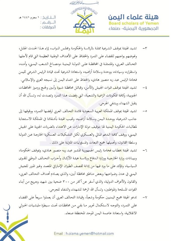 وأيدت «هيئة علماء اليمن» في بيان لها، كل الإجراءات والتحركات العسكرية باتجاه عدن، ودعت الحكومة والشعب والجيش إلى «أن يعملوا سريعًا على القضاء على التمرد»، في إشارة إلى المجلس الانتقالي الجنوبي في عدن، وقوات الأحزمة والنخب.