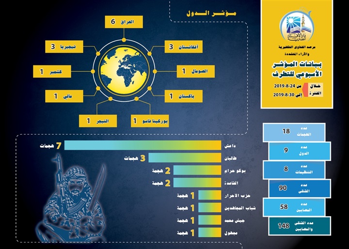 قال مرصد الفتاوى التكفيرية والآراء المتشددة التابع لدار الإفتاء المصرية: إن نشاط الجماعات الإرهابية في النصف الثاني من 2019 مازال مستمرًّا ومتزايدًا بالرغم من الجهود التنسيقية التي تقوم بها أجهزة الأمن في مختلف البلدان.