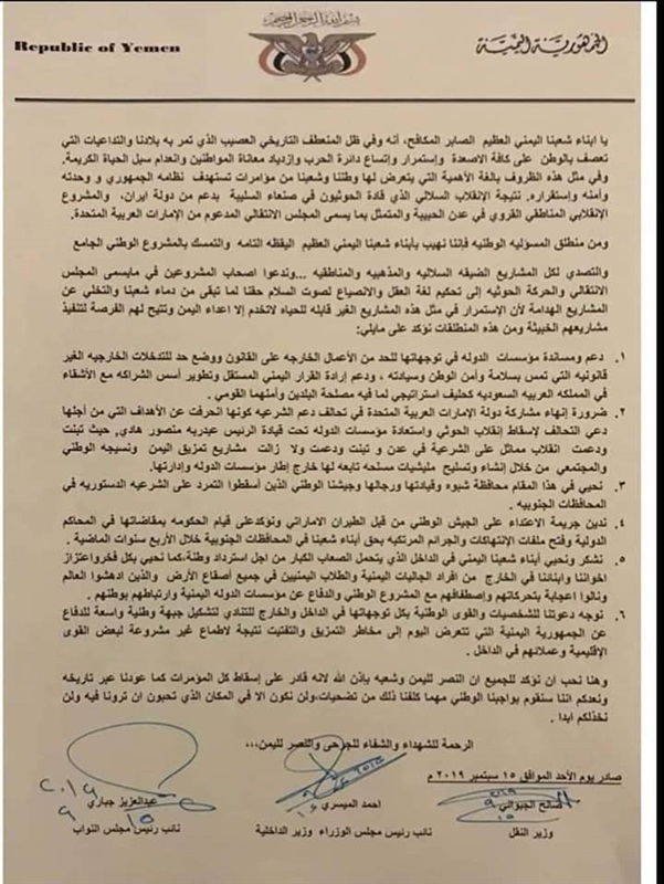 ونائب رئيس مجلس النواب اليمني عبدالعزيز الجباري، ونائب رئيس مجلس الوزراء، وزير الداخلية اليمني، أحمد الميسري، ووزير النقل اليمني صالح الجبواني، بيانًا بتوقيع الثلاثة، يدعو إلى إنهاء المشاركة الإماراتية في التحالف، علاوةً على الدعوة إلى وضع حد للتدخلات الخارجية التي تمس أمن اليمن ووحدته وسلامته، بحسب البيان الذي زعم أن الإمارات تدعم مشاريع تمزيق اليمن ونسيجه الاجتماعي، وهي الاتهامات الباطالة التي يسوقها حزب الإصلاح ضد دولة الإمارات.