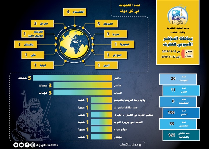 أصدر مرصد الفتاوى التكفيرية والآراء المتشددة، التابع لدار الإفتاء المصرية، مؤشر الإرهاب الأسبوعي، الذي يتناول بالرصد والتحليل خارطة الإرهاب حول العالم، وشهد المؤشر لهذا الأسبوع في الفترة من 16 إلى 22 نوفمبر 2019، 20 عملية إرهابية ضربت 11 دولة أسقطت 161 ما بين قتيل ومصاب، وذلك بزيادة 7 عمليات إرهابية عن الأسبوع الماضي الذي شهد 13 عملية إرهابية.