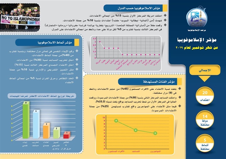 وقد أوضح المرصد في بيانه أنه قد تم رصد (20) اعتداءً تراوحت ما بين اعتداء على الأفراد المسلمين والمساجد والمهاجرين، وقد وقعت تلك الاعتداءات في (14) دولة مختلفة، وتراوحت أنماط الاعتداءات ما بين (الإيذاء النفسي، وتخريب مساجد، الاعتداء الجسدي، تمييز تشريعي وإداري، تظاهر وحرق القرآن).