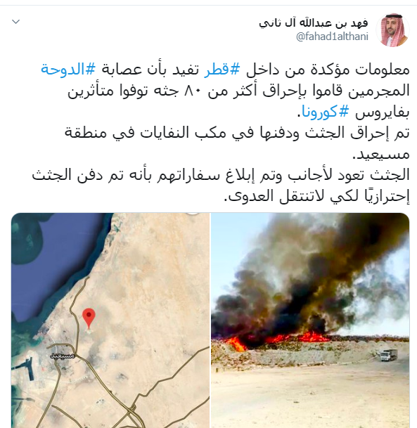وكتب عبر تغريدة على "تويتر": "معلومات مؤكدة من داخل قطر تفيد بأن عصابة الدوحة المجرمة قامت بإحراق أكثر من 80 جثة توفيت متأثرة بفيروس كورونا"، مضيفا فى تغريدة أخرى أن الجثث تعود لأجانب وتم إبلاغ سفاراتهم بأنه تم دفن الجثث إحترازيًا لكي لاتنتقل العدوى.
