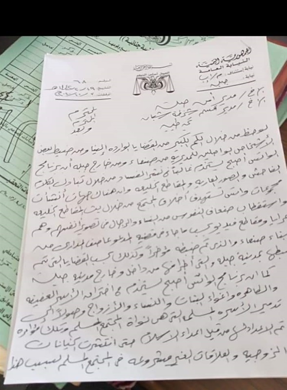 نشر ناشطون يمنيون، الخميس 8 أكتوبر 2020، مذكرة صادرة عن نيابة استئناف مديرية جِبلة في محافظة إب، الخاضعة لسيطرة ميليشيا الحوثي الانقلابية، تتضمن توجيهات لمدير أمن المديرية، الموالي لها، بالقبض على كل شخص يوجد في هاتفه تطبيق «واتس آب»، وكلف «فرقا نسائية» بتفتيش هواتف النساء.