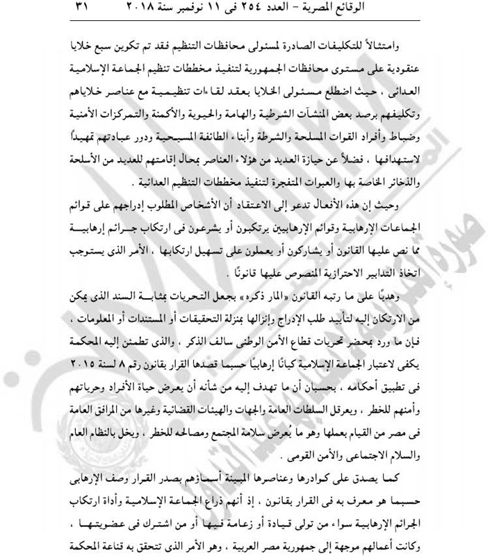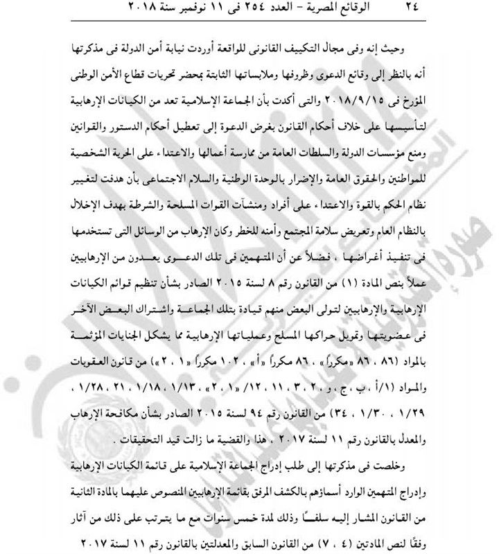 وانتهت المحكمة بالتصديق على كوادر الجماعة وعناصرها وصفهم الإرهابي حسبما هو معرف به في القرار بالقانون؛ إذ إنهم ذراع الجماعة الإسلامية وأداة ارتكاب الجرائم الإرهابية، سواء من تولى قيادة أو زعامة فيها، أو من اشترك في عضويتها، وكانت أعمالهم موجهةً إلى جمهورية مصر العربية، وهو الأمر الذي تتحقق به قناعة المحكمة بجدية طلب النائب العام؛ ما يتعين معه إدراج الجماعة الإسلامية على قائمة الكيانات الإرهابية، وإدراج المتهمين لمدة 5 سنوات.