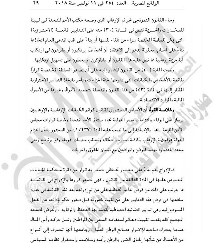 وأمرت المحكمة بنشر القرار على القائمين في الوقائع المصرية، مع ما يترتب على ذلك من آثار بقوة القانون طوال مدة الإدراج التي نظمتها المادة السابقة من القرار.