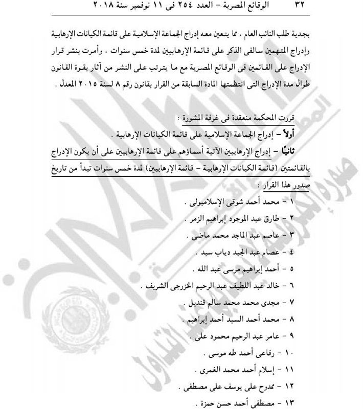 وضمت قائمة المدرجين على قوائم الإرهاب: «محمد شوقي الإسلامبولي، وطارق الزمر، وعاصم عبدالماجد»؛ وذلك لمحاولة إحياء نشاط الجماعة الإسلامية الإرهابي، والتحريض ضد الدولة، وتسليح بعض شباب الصعيد، وإعداد عروض عسكرية بالوجه القبلي، وارتباط العديد من العناصر في الجماعات الإسلامية بعناصر أجنبية.