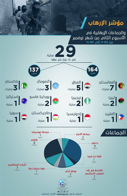 أكد مرصد الفتاوى التكفيرية والآراء المتشددة التابع لدار الإفتاء المصرية تراجع مؤشر الإرهاب خلال الأسبوع الأول من شهر نوفمبر الحالي، رغم أن عدد الضحايا قد شهد زيادة بلغت نحو 301 ما بين قتيل وجريح.