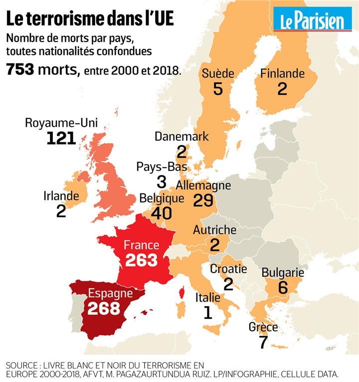 وتُعَدُّ إسبانيا ويليها فرنسا في مقدمة الدول التي تأثرت بالإرهاب، نتيجة استهداف محطة قطارات «أتوشا رينفي» بالعاصمة الإسبانية مدريد في 11 مارس 2004، ما أسفر عن مقتل 191 شخصًا وإصابة الآلاف؛ إضافة إلى عددٍ من العمليات الإرهابيَّة الأخرى مثل حادث الدهس الذي وقع في شارع لارامبلا ببرشلونة في 17 أغسطس 2017 وأدى إلى مقتل 13 شخصًا، وبهذا فقد خسرت إسبانيا ما يقرب من 268 شخصًا خلال العشرين عامًا الماضية.