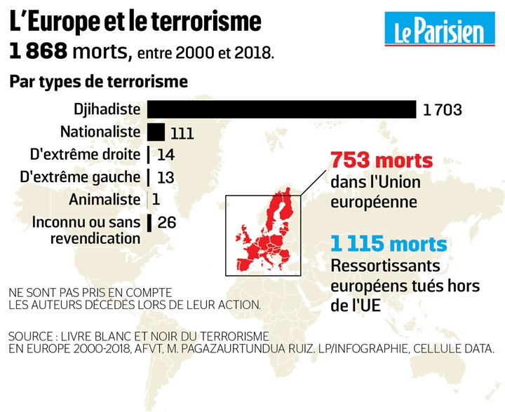 ووفقًا للكتاب فقد أكثر من 753 شخصًا لحياتهم نتيجة العمليات الإرهابية داخل حدود القارة الأوروبية، بينما إذا تم ضم المواطنين الأوروبيين الذين قُتِلُوا جراء الهجمات خارج البلاد إليهم، فسيصل عدد الضحايا إلى نحو 1115 حالة وفاة منهم العسكريين والسائحين والصحفيين والعاملين بمجالات المساعدة الإنسانية والعمال وغيرهم.