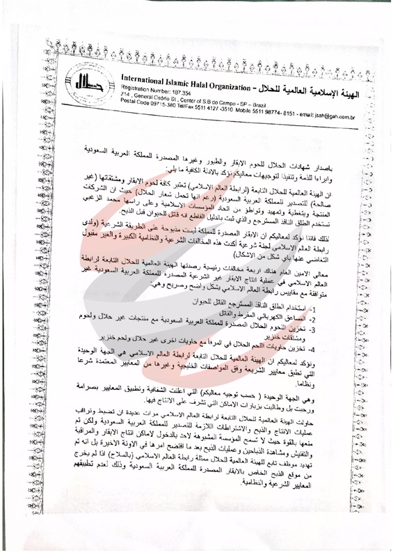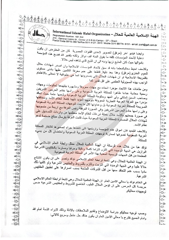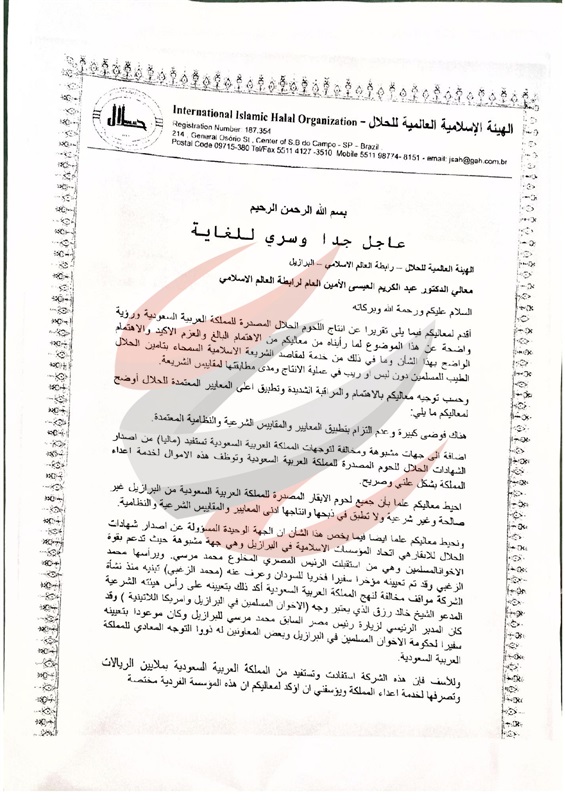 وفي رسالة وصلت (المرجع) كان كتبها أحمد إبراهيم وهبي، الذي يعمل بشركة وجمعيات الإخواني الصيفي، أرسلها لرابطة العالم الإسلامي، قال فيها: إن هناك فوضى بين الجهات المصدرة للحوم الحلال، وإن جميع الأبقار المصدرة للمملكة غير صالحة شرعًا، وهناك جهة مشبوهة تدعم بقوة جماعة الإخوان ويرأسها محمد الزغبي، الذي تم تعيينه مؤخرًا سفيرًا فخريًّا بالسودان؛ حيث على رأس شركته المصري الشيخ خالد رزق، الذي هو وجه الإخوان بالبرازيل، وإن الهيئة العالمية بالحلال (شركة الصيفي) تطلب تدخل الرابطة.