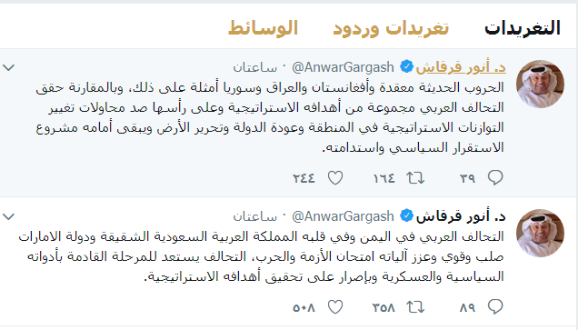 وغرد قرقاش، على موقع «تويتر» قائلًا: «التحالف العربي في اليمن وفي قلبه المملكة العربية السعودية الشقيقة ودولة الإمارات صلب وقوي، وعزز آلياته امتحان الأزمة والحرب».