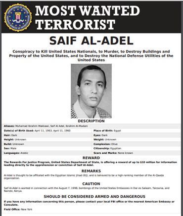 «عبدالله أحمد عبدالله» رفيق "سيف العدل" في عدد من الهجمات مثل أحداث السفارات الأمريكية بكينيا وتنزانيا إلى جانب العمليات الانتحارية التي وقعت في العاصمة السعودية الرياض في 2003 و2004.