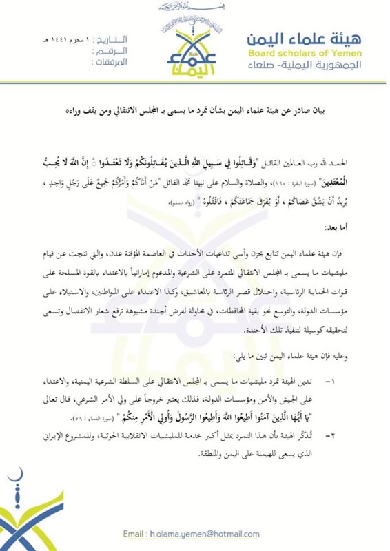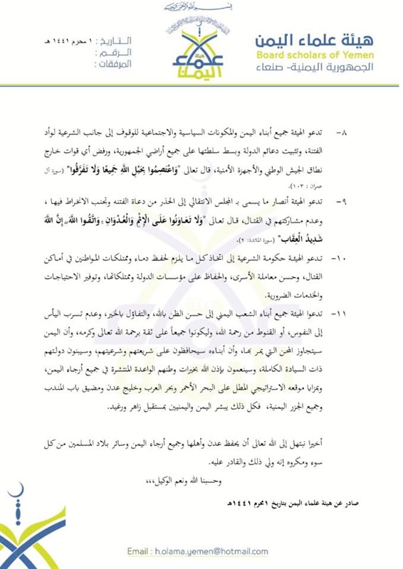 وأيدت «هيئة علماء اليمن» في بيان لها، كل الإجراءات والتحركات العسكرية باتجاه عدن، ودعت الحكومة والشعب والجيش إلى «أن يعملوا سريعًا على القضاء على التمرد»، في إشارة إلى المجلس الانتقالي الجنوبي في عدن، وقوات الأحزمة والنخب.