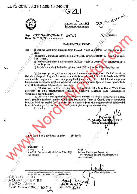 كما أظهرت الوثائق التي نشرتها شبكة «نورديك» توجيه تعليمات سرية من رئيس وحدة مكافحة الإرهاب في إسطنبول، كيهان آي؛ لإجراء تحقيق مع جميع ضباط الشرطة الذين تورطوا في ملاحقة خلية تنظيم القاعدة في الماضي، إلى جانب الحصول على بعض وثائق المحكمة والملفات السرية التي أوضحت لنورديك، أن مزاعم كارا ليس لها أي جدوى، ومع ذلك فقد بدأت عملية مطاردة ساحقة ضد المحققين الذين قاموا بقمع خلية القاعدة في إسطنبول، على الرغم من إظهار لائحة الاتهام الصادرة عام 2009، ضد المتهمين وبالأخص كارا ، فإن الأدلة كانت ساحقة وقائمة على الواقع وتقدم دليلًا دامغًا على أنه كان متشددًا متورطًا في أنشطة مسلحة لجماعات إرهابية.