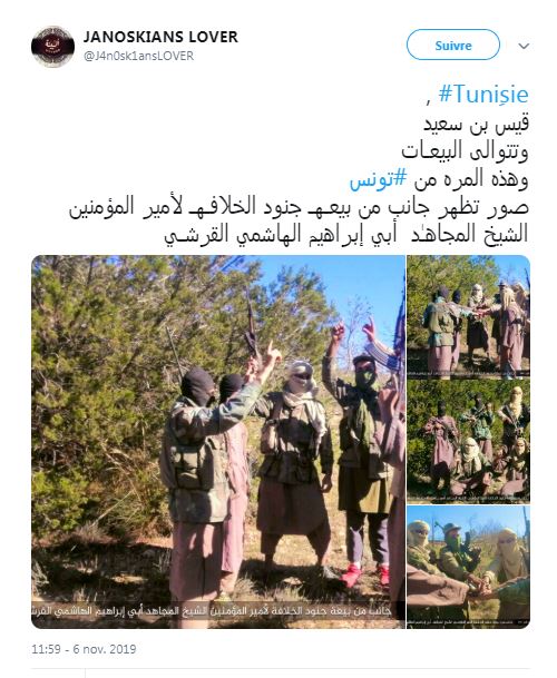 وظهر في الصور بحسب مواقع محلية، 6 عناصر يحملون أسلحة نارية، وهم بصدد مبايعة «القرشي» بأحد الجبال التونسية.