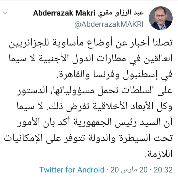 واتهم عبدالرزاق مقري رئيس «حمس» في تغريدة له بموقع التغريدات القصيرة «تويتر»، الحكومة بإهمال أوضاع الجزائريين العالقين في مطارات بعد الدول، مستغلًا الإجراءات الاحترازية التي اتخذتها البلاد في منع السفر منها وإليها.