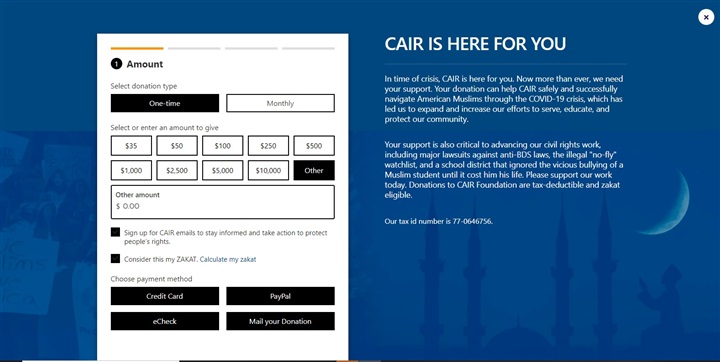 يعد مجلس العلاقات الإسلامية الأمريكية «CAIR» من أبرز المؤسسات التي اعتمدت استمارة التبرع، والتي تبدأ من 35 دولارًا ثم 50 دولارًا وصولاً إلى ما يشاء التابعون من الدفع، مشيرة في دعوتها إلى أن المساعدات المالية التي يقدمها الأفراد تساعد المجلس على القيام بمهامه في ظل انتشار كورونا، محددًا أبرز وظائفه في رفع الدعاوى القضائية ضد السلطات وقوانينها التي يراها المجلس غير مناسبة لمجتمعه.
