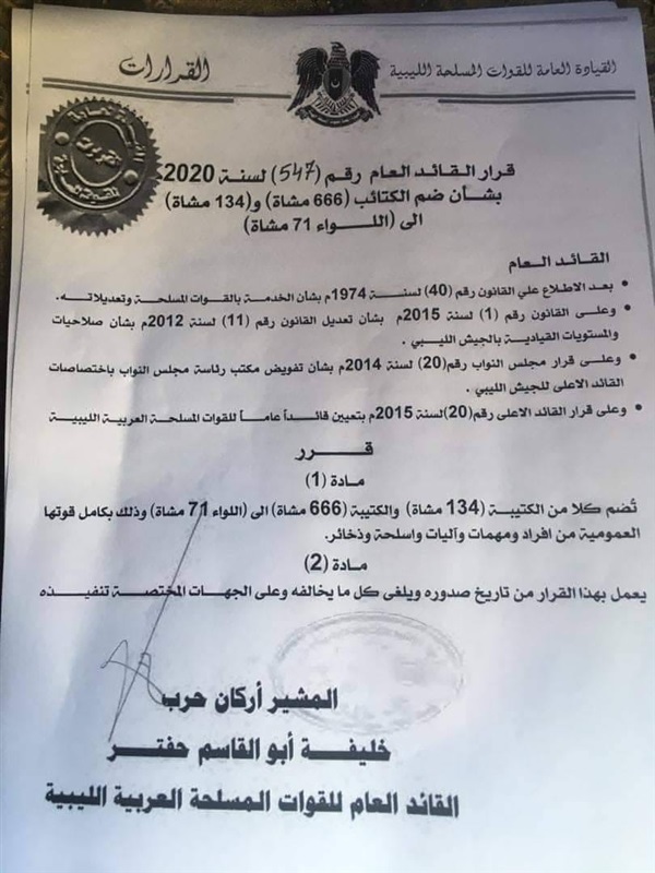 ووفق نص القرار الذي حمل رقم 547 لسنة 2020 «تضم كلا من الكتيبة 134 مشاة، والكتيبة 666 مشاة، إلى اللواء 71 مشاة، وذلك بكامل قوتها العمومية من أفراد ومهمات وآليات وأسلحة وزخائر».