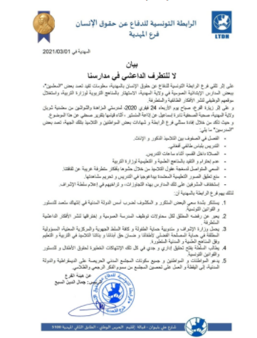 قال المرصد الوطني لمدنية الدولة في تونس، إنه رصد الأسبوع الجاري انتشارًا لأفكار متطرفة في بعض المدارس التونسية، وبالتحديد في محافظة المهدية الساحلية، تتعلق بسلوك عدد من المعلمين في مدرستين تقعان في معتمدية «شربان» بالمحافظة، يحرضان الطلاب على ممارسة العنف ونشر سلوكيات المتطرفين.