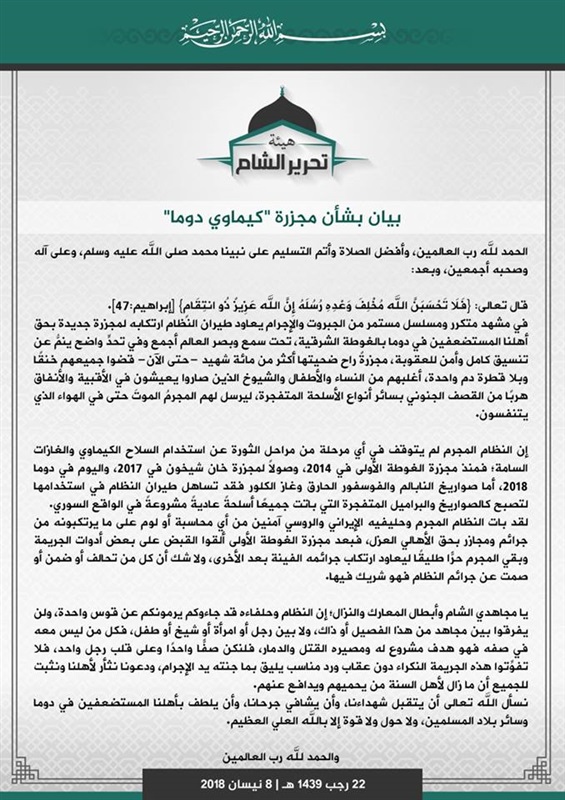 أصدرت هيئة تحرير الشام بيانًا، اليوم الأحد، بشأن الهجوم الكيماوي الذي استهدف مدينة دوما بريف دمشق، والذي أسفر عن مقتل 100 شخص، وإصابة المئات، مساء أمس السبت.