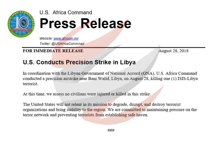 ومن جانبه أعلن (الأفريكوم) منذ قليل على صفحته على موقع التواصل «تويتر» تنفيذه الغارة بالتنسيق مع حكومة الوفاق الليبية، مؤكدًا عدم وجود ضحايا أو مصابين من المدنيين، مشيرًا إلى عزم الولايات المتحدة المضي في رؤيتها لمواجهة الإرهاب والجماعات المسلحة لإعادة الاستقرار للمنطقة.