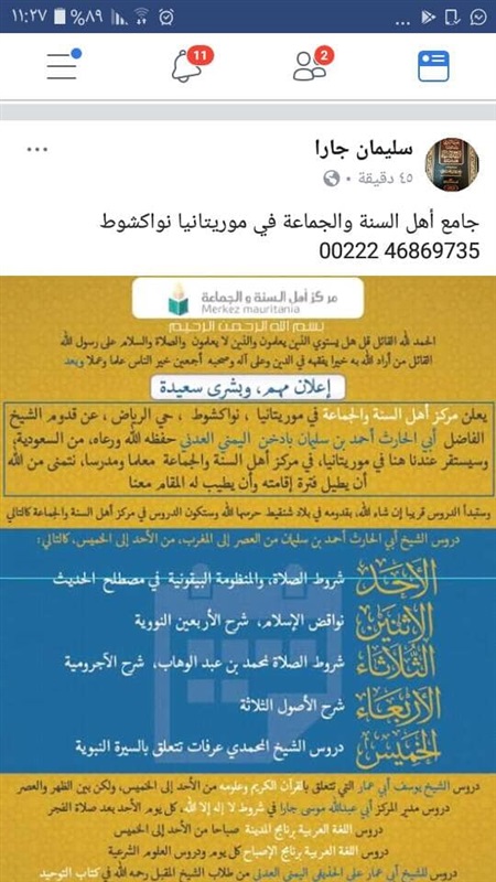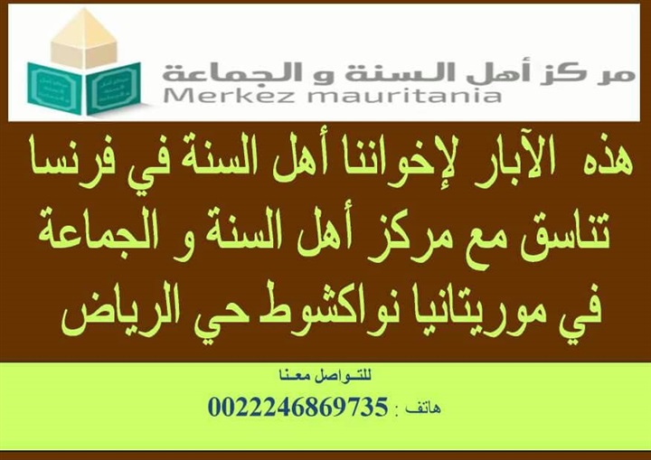 من مركز «أهل السنة والجماعة» بموريتانيا، دعا «أبوالحارث بن سليمان العدني»، المدرس المحسوب على تيار السلفية المدخلية، خلال خطبة الجمعة الماضي 28 سبتمبر 2018، إلى طاعة ولي الأمر الشرعي في البلاد الرئيس «محمد ولد عبدالعزيز»، وعدم الخروج عليه.