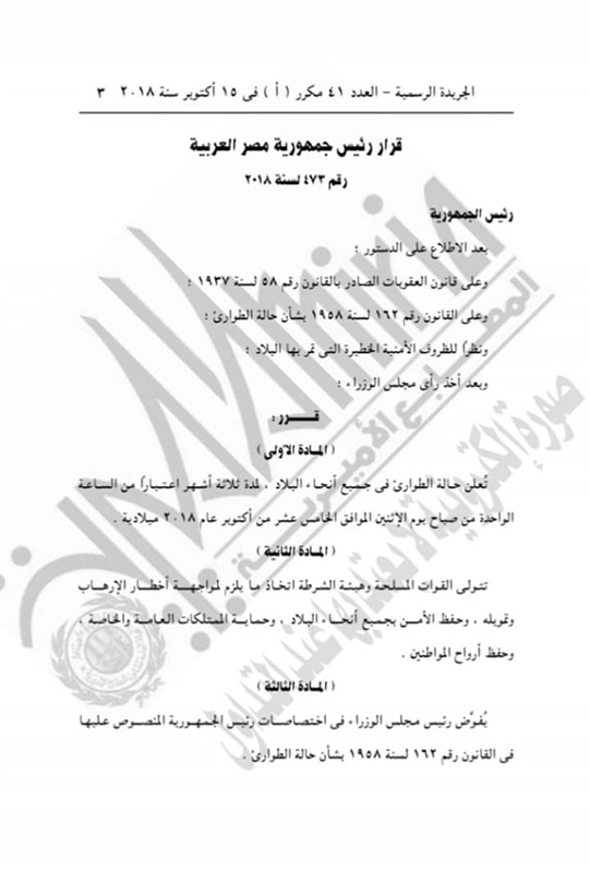 أصدر الرئيس عبدالفتاح السيسي، القرار رقم 473 لسنة 2018، بإعلان حالة الطوارئ فى جميع أنحاء البلاد لمدة ثلاثة أشهر.