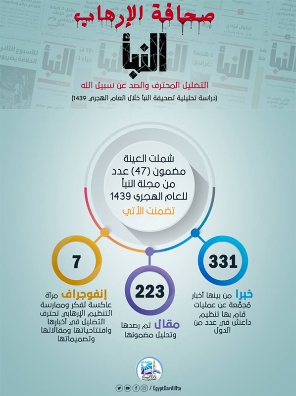 أصدر مرصد الفتاوى التكفيرية والآراء المتشددة التابع لدار الإفتاء المصرية دراسة تحليلية (كمية وكيفية) لمضمون أعداد صحيفة «النبأ»، الصادرة أسبوعيًّا عما يُسمى بـ«ديوان الإعلام المركزي» التابع لتنظيم داعش، وبلغت عينة الدراسة 47 عددًا صدرت جميعها خلال العام المنصرم.