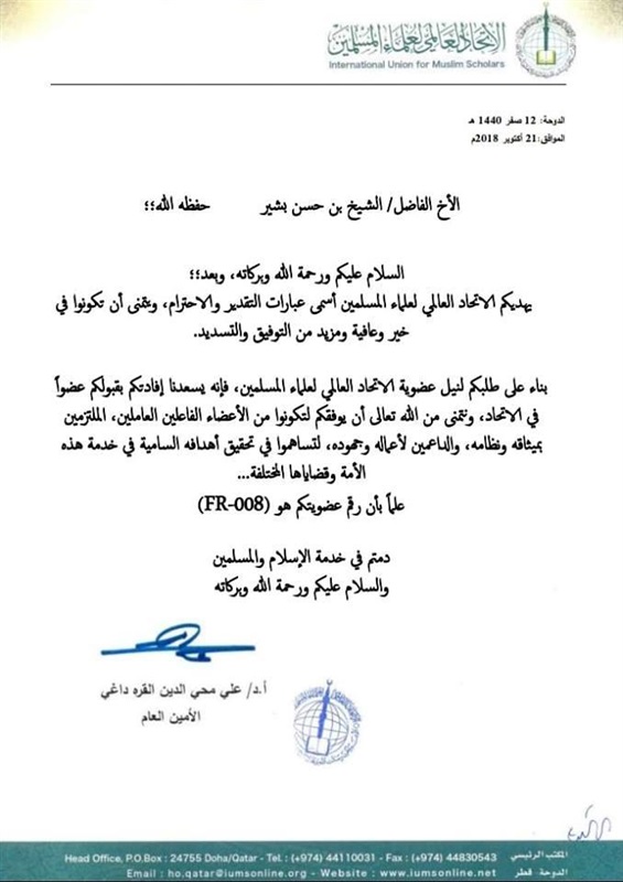 لائحة «الاتحاد العالمي لعلماء المسلمين»، فإن شروط قبول العضوية أن يتقدم الشخص