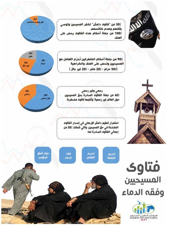 أما ما يخص فتاوى تنظيم داعش الإرهابي، فقد أكد مؤشر الفتوى العالمي أن 30% من جملة فتاوى «داعش» صدرت بحق المسيحيين، وأن 100% من جملة أحكام هذه الفتاوى تحض على العنف ضد المسيحيين؛ حيث دأب التنظيم على إصدار الفتاوى المفخخة، والتي تحض على قتالهم، كان من أبرزها فتوى اعتبارهم ليسوا أهل ذمة؛ وبالتالي يجب قتالهم، وهدم كنائسهم، وعدم ترميمها، وعدم توليهم مناصب داخل الدولة، وتكفير الحاكم الذي لا يُنفذ هذه الأمور.