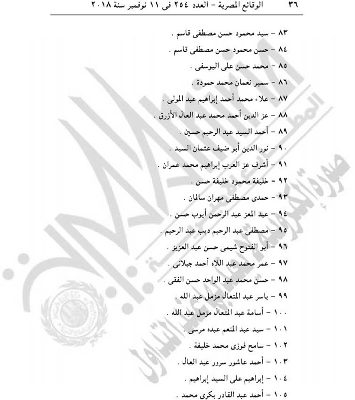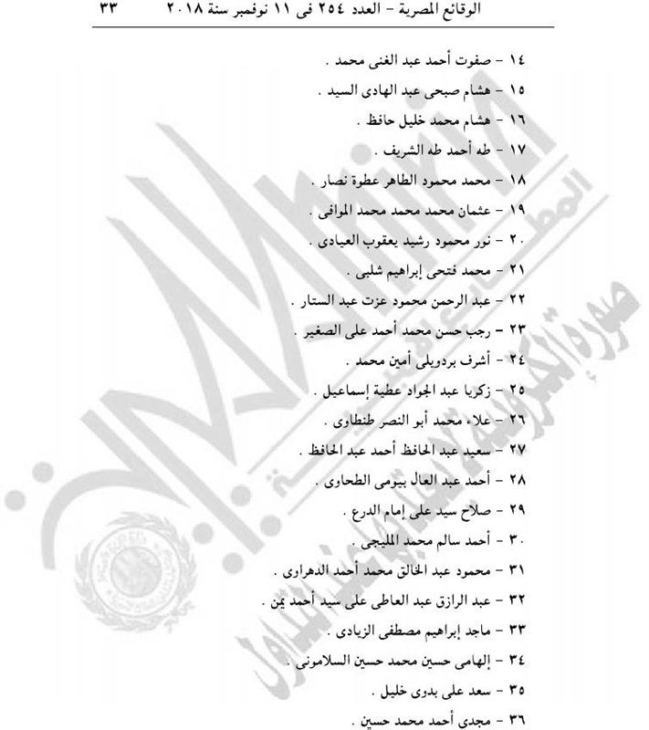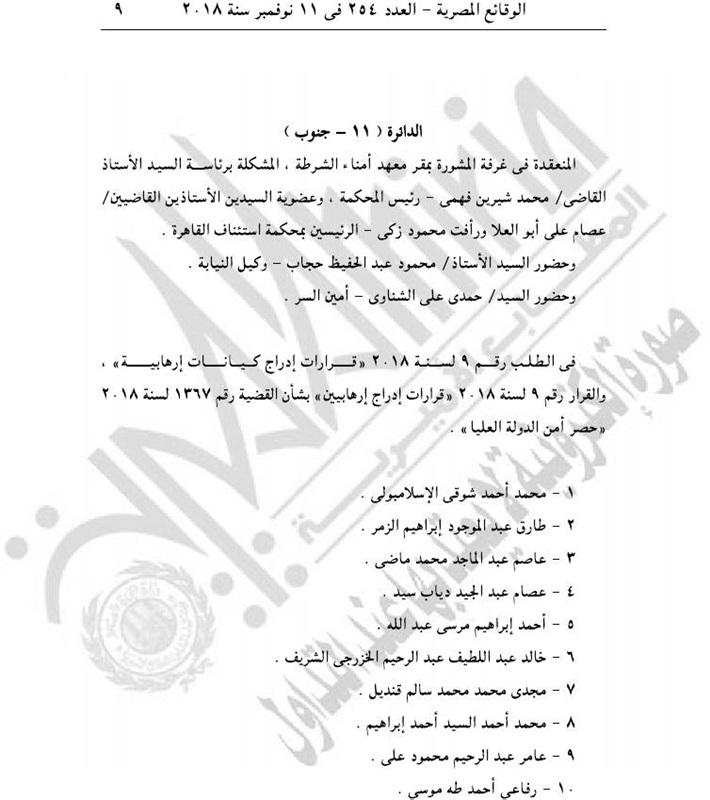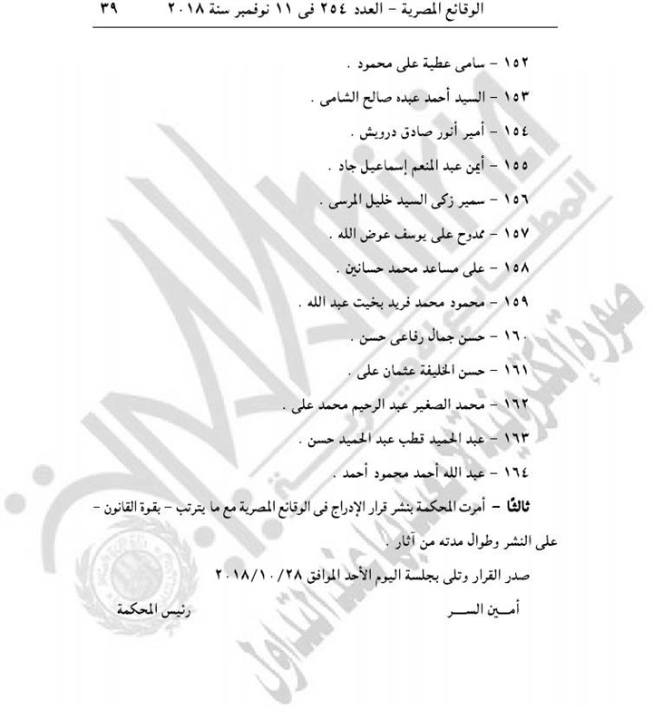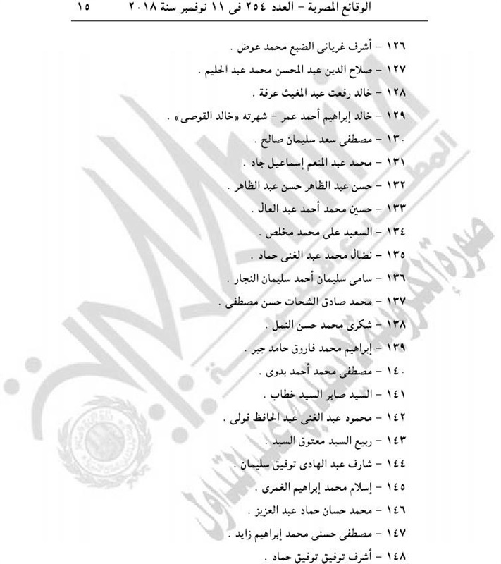 نشرت الجريدة الرسمية، اليوم الأحد، قرار محكمة الجنايات المنعقدة بمعهد أمناء الشرطة بطرة، رقم 1367 لسنة 2018، برئاسة المستشار محمد شرين فهمي بإدراج، 164 فردًا من المنتمين إلى الجماعات الإسلامية على قوائم الإرهاب.