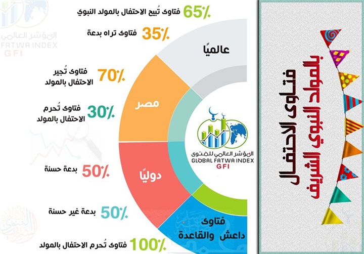 كشف «المؤشر العالمي للفتوى» التابع لدار الإفتاء المصرية والأمانة العامة لدور وهيئات الإفتاء في العالم، رصده فتاوى متنوعة حول الاحتفال بـ«المولد النبوي الشريف»، مؤكدًا أنه رصد عينة من الفتاوى قوامها 500 فتوى متنوعة، صادرة من جهات أو مؤسسات رسمية وفتاوى منفردة أصدرتها تيارات ومنظمات متطرفة، سواء أكانت فتاوى حديثة أم مُعاد نشرها، على المستوى المحلي والإقليمي والدولي، فوجد أن 65% من إجمالي الفتاوى على مستوى العالم تجيز الاحتفال في مقابل 35% تحرمه.