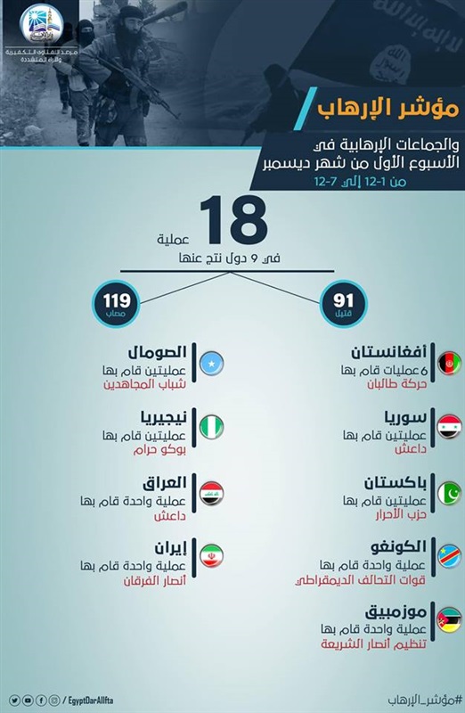 أوضح المؤشر الأسبوعي لمرصد الفتاوى التكفيرية والآراء المتشددة التابع لدار الإفتاء المصرية، أن موجات الإرهاب شهدت تراجعًا خلال الأسبوع الأول من ديسمبر الجاري؛ حيث نفذت 8 جماعات إرهابية نحو 18 عملية إرهابية في 9 دول، أوقعت 210 ما بين قتيل وجريح.