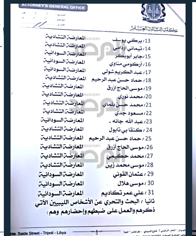 ومن بين الأسماء المطلوبة عبدالحكيم الخويلدي بلحاج، وحمدان أحمد حمدان، إبراهيم سعيد الجضران، وعلي الهوني، ومختار أرخيص.