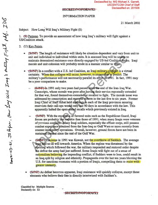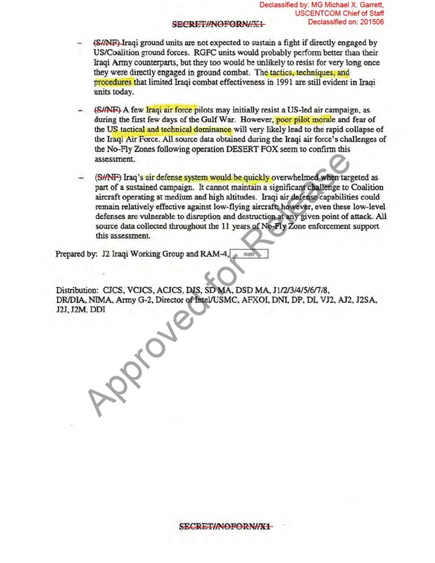 وأوضحت الوثيقة «السرية للغاية» أن المعلومات الواردة تم التحصل عليها من خلال عمليات الاستطلاع الجوي التي نفذتها الطائرات الأمريكية خلال العملية العسكرية الشهيرة المسماة بـ«ثعلب الصحراء»، وهي هجمة نفذتها القوات الجوية للولايات المتحدة وبريطانيا في العراق خلال الفترة من 16 ديسمبر إلى 19 ديسمبر 1998، بحجة أن العراق لم يتعاون بالشكل الكافي مع لجنة المفتشين التابعين للوكالة الدولية للطاقة الذرية بخصوص ملف أسلحة الدمار الشامل، وتم خلال تلك العملية فرض حظر على الطيران العراقي في جنوب البلاد وفي مناطق الأكراد بإقليم كردستان، ومن خلال ذلك استطاعت القوات الأمريكية جمع المعلومات الخاصة بالجيش العراقي وعدد عناصره و تسليحه، ما يعني أن تلك العملية لم تكن في واقعها لحماية العالم من شرور الأسلحة العراقية وإنما كانت تمهيدًا لحرب مزعومة لتدمير الدولة وتقسيمها.