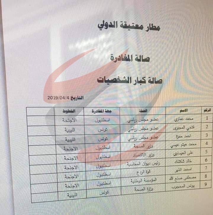 حصل موقع «المرجع» على وثيقة سرية تثبت هروب عدد من كبار الشخصيات الليبية عبر صالة كبار الشخصيات في مطار معتيقة الدولي في ليبيا، وذلك عقب إصدار المشير خليفة حفتر، قائد الجيش الوطني الليبي، أوامر بإطلاق عملية «طوفان الكرامة»، والتي تهدف إلى تحرير العاصمة الليبية طرابلس من الميليشيات المسلحة التي تسيطر عليها بقيادة فايز السراج.