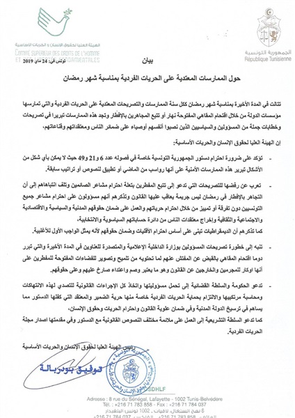 من جانبها قالت الهيئة العليا لحقوق الإنسان والحريات الأساسية التونسية: «تكرر بمناسبة شهر رمضان ككل سنة، الممارسات والتصريحات المعتدية على الحريات الفردية، من خلال اقتحام المقاهي المفتوحة نهار أو تتبع المجاهرين بالإفطار، وتجد هذه الممارسات تبريرًا في تصريحات وخطابات جملة من المسؤولين والسياسيين الذين نصبوا أنفسهم على ضمائر الناس ومعتقداتهم وقناعاتهم»، مشددة على ضرورة احترام الدستور التونسي.