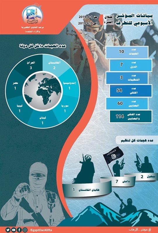 رصد مرصد الفتاوى التكفيرية والآراء المتشددة التابع لدار الإفتاء المصرية في مؤشر الإرهاب الأسبوعي، -الذي يهتم بتتبع العمليات الإرهابية ورصدها وإجراء تحليل لها- وقوع 10 عمليات إرهابية تم تنفيذها خلال الأسبوع الأول من يونيو 2019، استهدفت 7 دول مختلفة هي (أفغانستان، العراق، إندونيسيا، سوريا، لبنان، ليبيا، مصر) في مناطق جغرافية متباعدة نفذتها أكثر من جماعة متطرفة مختلفة التوجه؛ ما أدى لسقوط ما يقرب من 54 قتيلًا و60 مصابًا؛ ما يشير إلى التراجع النسبي في خريطة العمليات الإرهابية خلال فترة الرصد مقارنة بالأسبوع الأخير من شهر مايو.